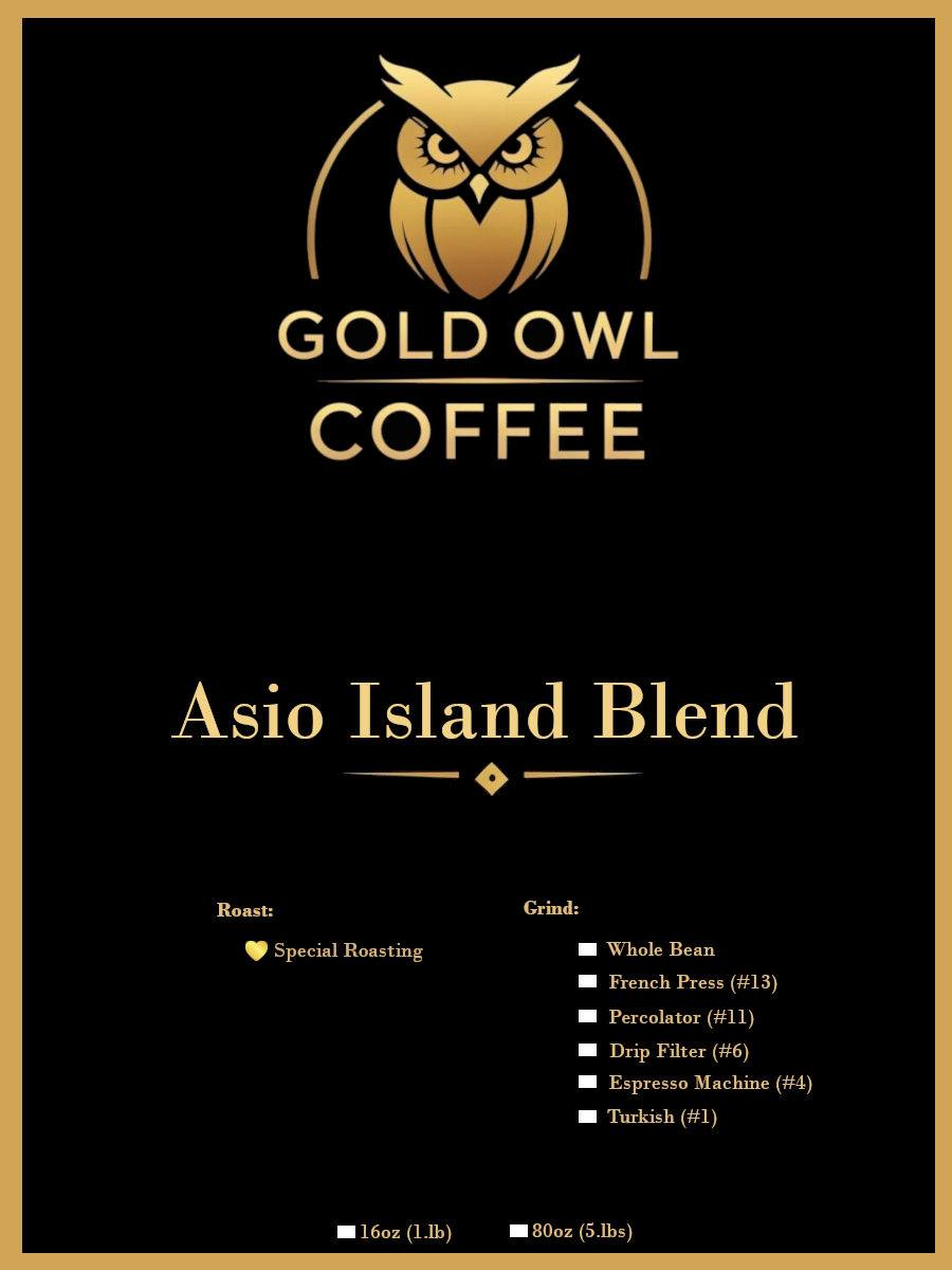 Elevate your daily ritual with premium taste on a budget. Asio Island Blend is your passport to smooth, rich enjoyment, perfectly prepared just for you. Get ready to experience coffee luxury, the Gold Owl Coffee way!